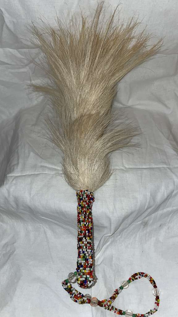 A finely crafted small irukere featuring soft, natural horsetail hair and a tightly hand-wrapped handle adorned with vibrant multicolored seed beads. Finished with a beaded wrist cord for secure handling and ease of use during ritual work.